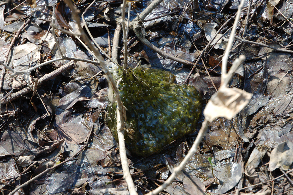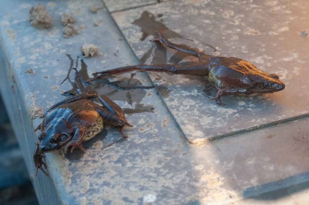 Nella foto sono ritratte due rane che, “disturbate” durante i lavori alla sorgiva dei tritoni effettuati in gennaio, sono emerse dal fondo fangoso .