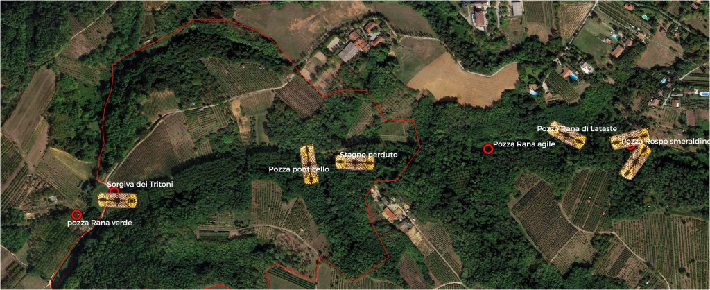 Sorgiva dei Tritoni 0/Pozza del ponticello 19/ Stagno Perduto 0/Pozza Rana di Lataste 0/ Pozza Rospo smeraldino 0/Fosso 0.