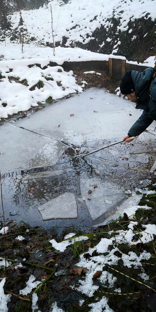 La sorgiva dei tritoni e lo stagno perduto hanno uno strato di ghiaccio così spesso che è stato impossibile recuperare le nasse.